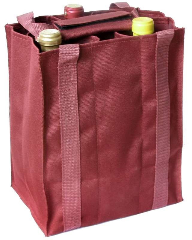 Praktická taška na šest láhví, případně na láhve a skleničky. Je vyrobena z pevné látky a ucha jsou spojena suchým zipem.